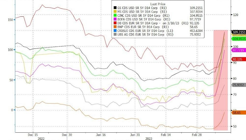 除了瑞信,德銀、法國巴黎銀行、瑞銀、美銀等其他歐美大行的 CDS 也在增擴。
