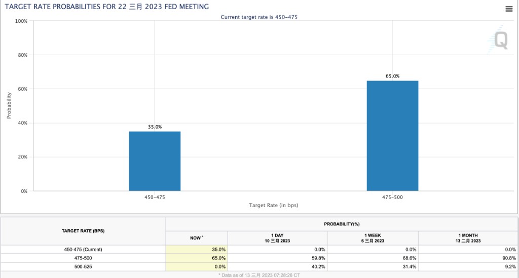 根據芝加哥商交所的 FedWatch 最新數據顯示,3 月美聯儲不加息概率為 35%,一天前尚為 0;加息 25 個基點的概率為 65%,一個月前為 90%;加息 50 個基點的概率降至 0,在硅谷銀行倒閉之前的可能性曾高達 70%。
