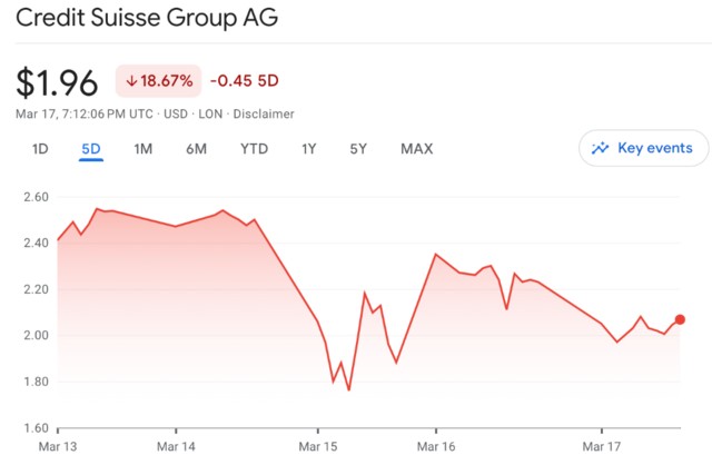 週五,瑞信回吐週四因獲瑞士央行流動性擔保而大漲的近半數漲幅,收跌 8%,報 1.96 美元。瑞信股價本週下跌了約 19%。