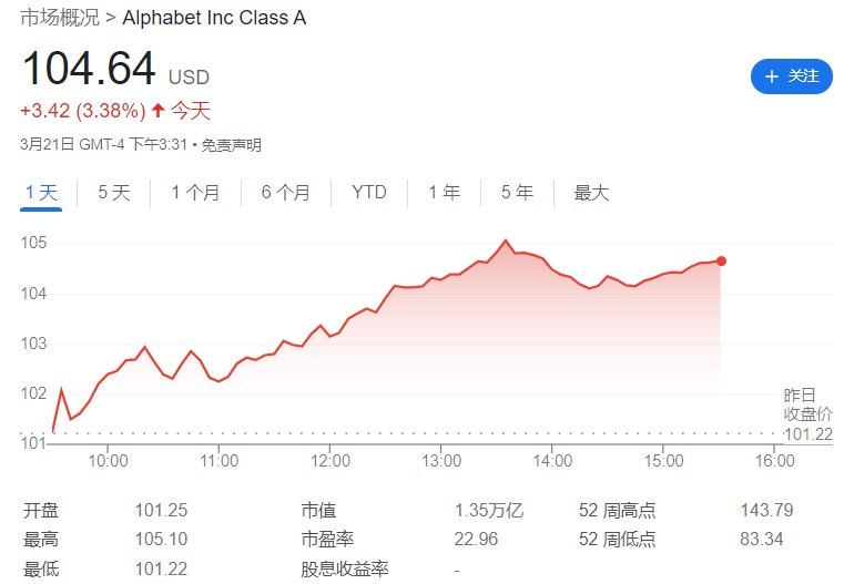 週二的消息公佈後,谷歌股價走強,接近美股尾盤時,股價上漲近 3.4% 至 104.64 美元,盤中一度漲近 4%。