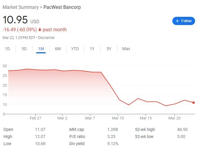3 月 22 日週三,總部位於美國加州洛杉磯的地區銀行西太平洋合眾銀行(PacWest Bancorp)股價跌超 10%,脱離昨日所創的一週高位,本週頭兩日均上漲且累漲超 31%,上週五曾創新低。