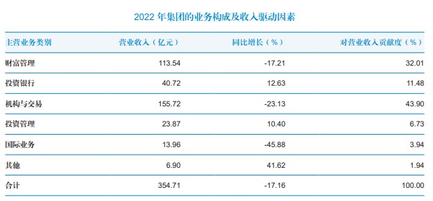 機構及交易業務營業收入 155.72 億元,佔營業收入的 43.90%,同比下降 23.13%,營業利潤率下降 5.50 個百分點,主要受到證券市場波動影響,金融資產投資收益下降;