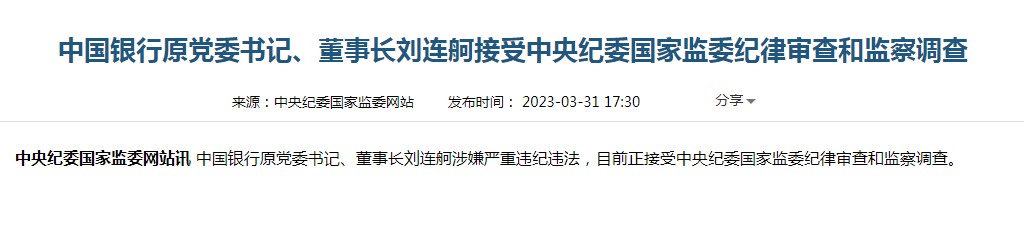 3 月 31 日,中央紀委國家監委網站發佈公告,中國銀行原黨委書記、董事長劉連舸涉嫌嚴重違紀違法,目前正接受中央紀委國家監委紀律審查和監察調查。