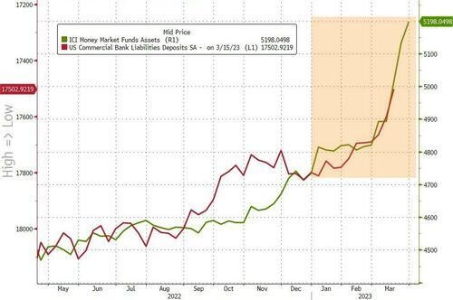FDIC 數據顯示,去年,美國商業銀行自 1948 年來首次出現存款下滑。整個一季度,貨幣基金市場獲得 4500 億美元淨流入,銀行存款則有 3000 億美元淨流出。