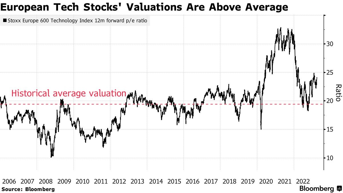 全球科技股風向標——納斯達克 100 指數自今年以來的漲幅超過 20%,於 3 月底邁入 “技術性牛市”。此外,歐洲的科技股同樣是該地區 2023 年表現最好的板塊之一。斯托克 600 歐洲科技指數 (Stoxx Europe 600 Technology Index) 的預期市盈率達到 24 倍,高於 19.4 倍這一歷史平均水平。
