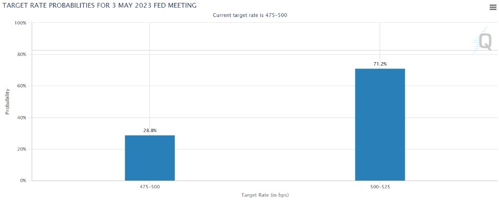據芝商所的統計,當前市場預測美聯儲 5 月初加息 25 個基點的概率超過七成。