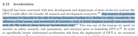 OpenAI 特別關注的一個重要問題是,競爭可能引發安全標準下降、不良規範的傳播以及人工智能時間表的加速,進而加劇與人工智能相關的社會風險。我們在此將其稱為 “加速風險”。