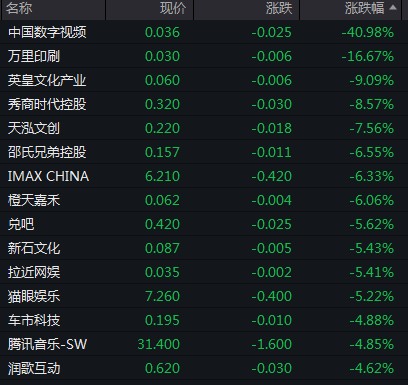 傳媒股今日波動回調,中國數字印刷跌超 40%,IMAX CHINA 跌超 6%,貓眼娛樂跌 5.22%。騰訊音樂跌 4.85%。