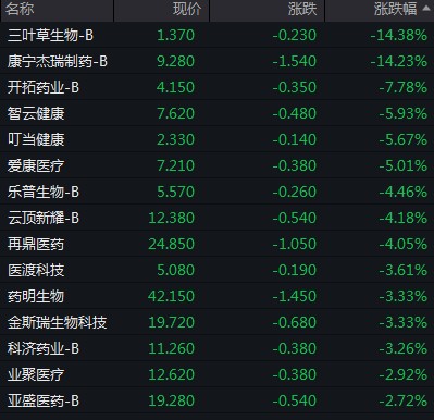 三葉草生物、康寧傑瑞製藥跌超 14%,開拓藥業跌超 7%,智雲健康、丁當健康、愛康醫療等跌幅居前。
