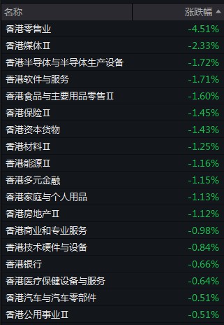盤面上大部分板塊飄綠,傳媒、半導體、軟件、金融等領跌,電信與食品飲料板塊收漲。