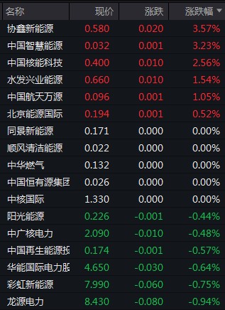 協鑫新能源、中國智慧能源、中國核能科技領漲板塊,水發興業能源等跟漲,大唐新能源跌 5.03% 領跌板塊。