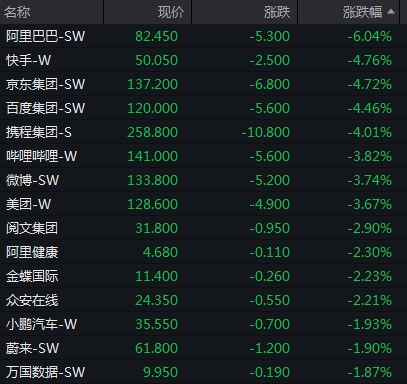 恒生科技指數收跌 2.43%,傳媒、半導體領跌,阿里巴巴跌超 6%