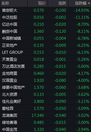 首創鉅大、中泛控股跌超 10%,億達中國、融創中國跌超 8%,碧桂園、龍湖集團、綠地香港跌超 3%。