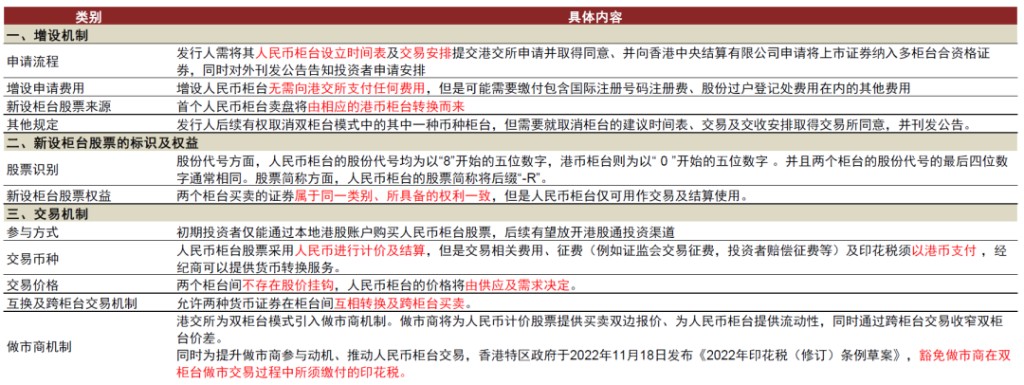 相較於 2011 年推出的流動性較差的雙幣雙股模式,此次的雙櫃枱模式,從設計上來看上市公司的參與成本下降和參與意願大幅提升、且引入做市商機制促進流動性改善,從推出背景來看港股通已成為港股市場重要的參與者、且人民幣國際化趨勢加速,後續發展值得期待。
