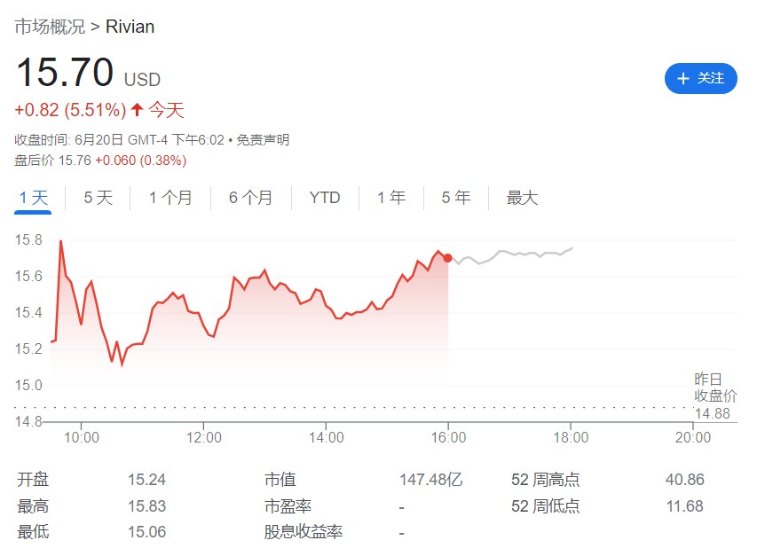 週二,Rivian 股價高開高走,收漲 5.5%。自 5 月底特斯拉和福特達成類似的交易以來,特斯拉股價已經累計上漲了 40% 以上,週二收漲 5.3%。