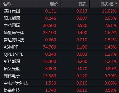 靖洋集團漲約 11%,中芯國際漲約 3%,華虹半導體漲逾 1.6%。