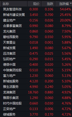 內房股結束四連跌,今日反彈衝高。合景泰富漲近 9%,龍光集團漲 7.5%,新城發展、遠洋集團、富力地產等漲逾 5%。