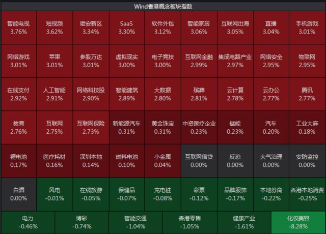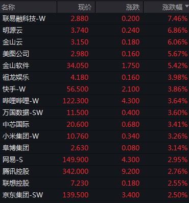 聯易融科技漲逾 7%,明源雲、金山雲漲逾 6%,美圖公司、金山軟件漲逾 5%。騰訊、聯想、京東漲逾 2%。