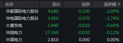 華能國際跌逾 2%,華電國際電力跌逾 1.7%。