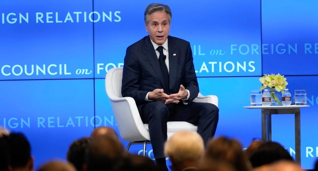 布林肯 28 日參加一場由美國智庫外交關係委員會主辦的活動,並在活動上發言。“美國之音” 網站報道配圖