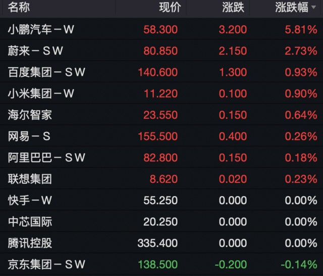 科技股方面,小鵬汽車漲近 6%,蔚來漲逾 2.7%,百度、小米、網易、阿里小幅上漲,萬國數據回調近 4%,金山軟件、華虹半導體跌逾 1%。