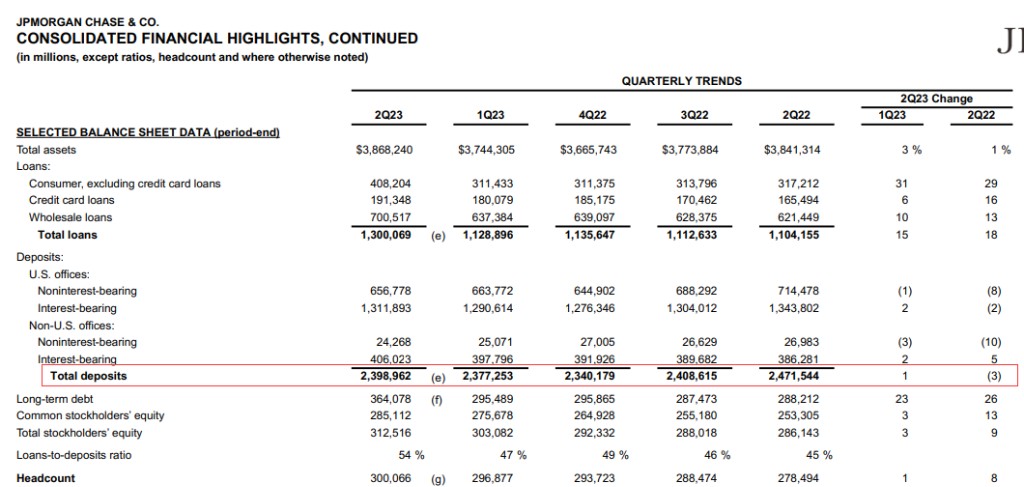 另外,截至二季度末,摩根大通存款餘額為 2.40 萬億美元,同比減少 3%,環比微增 1%。按平均存款來統計,摩根大通二季度的平均月度存款同比下降 6%。