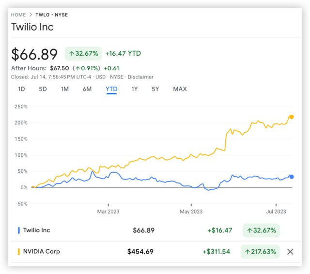今年以來,Twilio 已累計漲超 32%,不過,同期英偉達已漲超 217%,突破歷史新高。