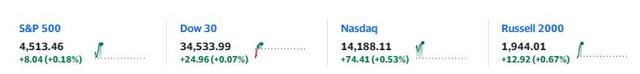 7 月 17 日週一,標普 500 指數和納指小幅高開,道指小幅低開。開盤近一小時,道指止跌轉漲,標普大盤站穩 4500 點整數位上方,科技股居多的納指和羅素小盤股領跑主要股指。