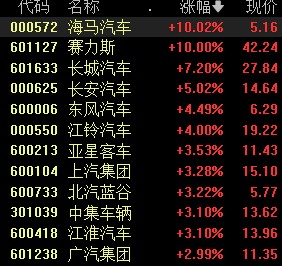 汽车产业链低开高走,海马汽车、赛力斯涨停,维科精密、鹏翎股份涨超 10%,长城汽车大涨 7%。
