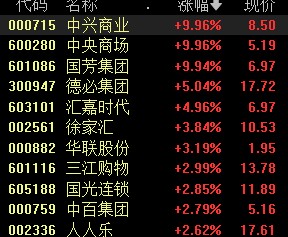 零售股震荡反弹,国芳集团直线涨停,中央商场涨超 7%,徐家汇、三江购物、华联股份、汇嘉时代等跟涨。