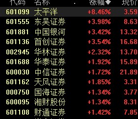 券商股早盘再度冲高,太平洋再度涨停 4 天 3 板,东吴证券、首创证券、中国银河、天风证券、国海证券等纷纷跟涨。