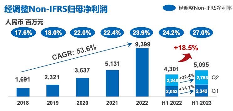 2023H1,藥明康德營收 188.71 億元,同比增長 6.3%,剔除新冠商業化項目同比增長 27.9%;上半年歸母淨利潤 53.13 億元,同比增長 14.6%;上半年經調整 Non-IFRS 歸母淨利潤 50.95 億元,同比增長 18.5%。