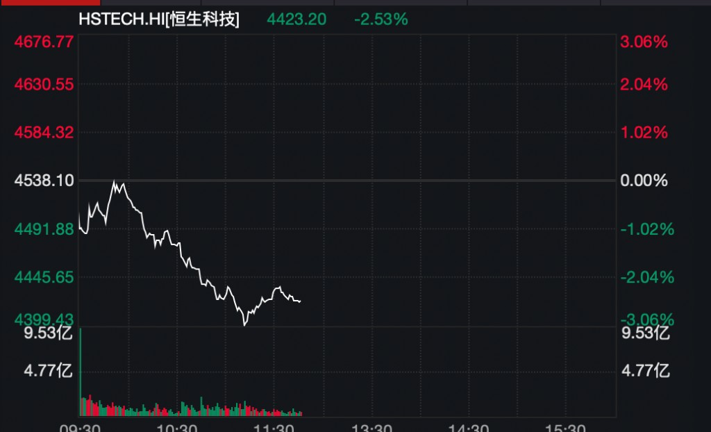 亞太股市指數創下近一個月來最大跌幅。港股與 A 股雙雙走低,恒生科技指數盤中跌超 3%。