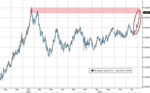 30 年期美國國債收益率在過去三個交易日已累計上漲了近 25 個基點,回到了去年 11 月中旬時的水平。10 年期美債收益率週四也進一步升至了九個月高位 4.13% 左右。