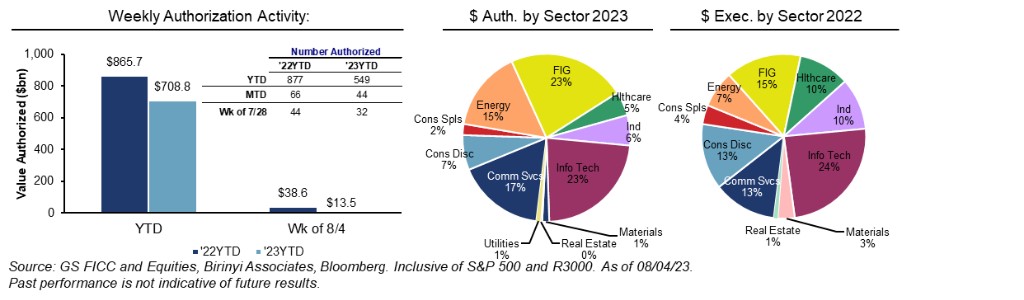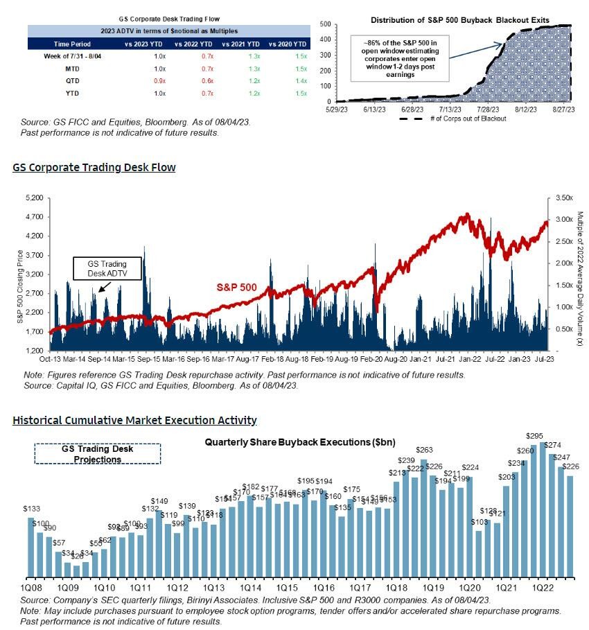 高盛企業交易櫃枱的活躍資金流數據顯示,到截至 8 月 4 日的上週,今年的企業回購成交量是去年初以來平均日交易量(ADTV)的 0.7 倍,是 2021 年初以來 ADTV 的 1.3 倍。今年的回購資金側重於通信服務、金融和科技板塊。