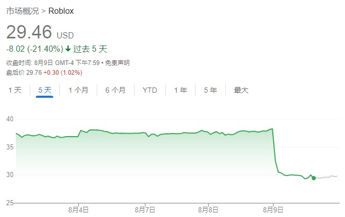 財報發佈後,Roblox 股價在當日交易中下跌 21.4%。