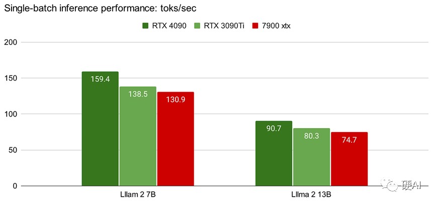 通过这种优化方法,在最新 Llama2 的 7B 和 13B 模型中,用一块 AMD Radeon RX 7900 XTX,速度已可达到英伟达 RTX 4090 的 80%,或是 3090Ti 的 94%。