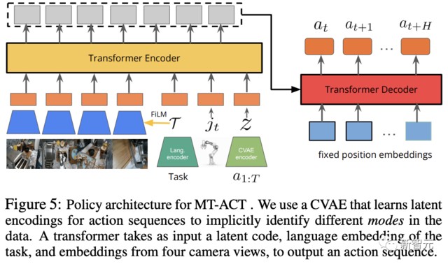 MT-ACT 的策略架構設計為一個有足夠容量的 Transformer 的模型,可以處理多模態多任務機器人數據集。