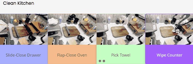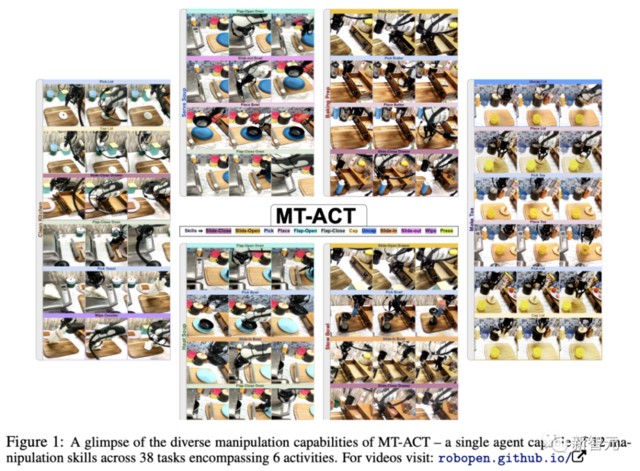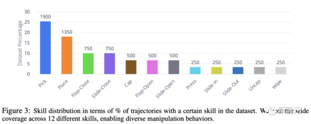 雖然常用的「拾取 - 放置」技能在數據集中佔 40% ,但也包括豐富的接觸技能,如擦拭、蓋帽,以及涉及鉸接物體的技能(翻轉 - 打開、翻轉 - 關閉)。