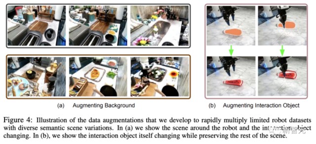 由於收集的數據集無法滿足對場景和物體多樣性的需求,因此研究人員通過離線添加不同變化的場景來增加數據集,同時保留每個軌跡中的操縱行為。