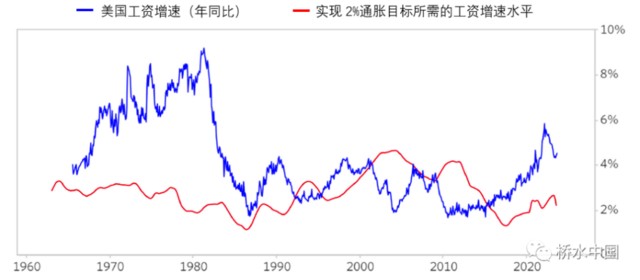 根據上述框架,我們可畫出歷史工資增速,以及要實現通脹目標所需要的工資增速。如下圖所示,目前工資的年增速約為 4.5%,距離實現目標所需要的水平(2-2.5% 左右)還比較遙遠。