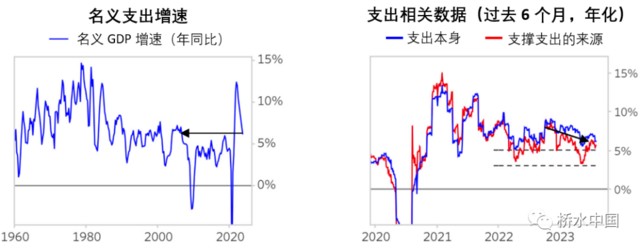 兩個角度均表明,今年上半年以來,雖然名義支出增速下降,但仍維持在 5.5-6.5% 的過高水平。
