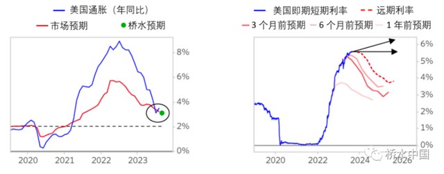 觀察上文提到的兩個條件弱,目前的措施並不足以將通脹一路降至 2%。更有可能發生的情況是,通脹率不再繼續下降,而是穩定在當前水平(左圖),這將推動美聯儲保持緊縮態勢。然而,市場在美聯儲暫緩加息後預期其很快轉向寬鬆(右圖),這可能難以實現。如果美聯儲保持緊縮態勢,具體可能體現為加息,也可能體現為維持當前的高利率。無論是哪種,風險資產表現都可能承壓。