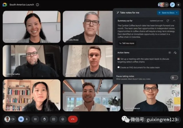 首先,Duet AI 推出了 “為我做筆記”功能,能夠實時捕獲筆記、操作項和視頻片段,這些筆記可以保存到 Google 文檔,並在會議結束後作為摘要發送給與會者。如果你遲到了,你進入會議後還可以看到 AI 整理的 “到目前為止的摘要”,快速瞭解參加前的會議內容。