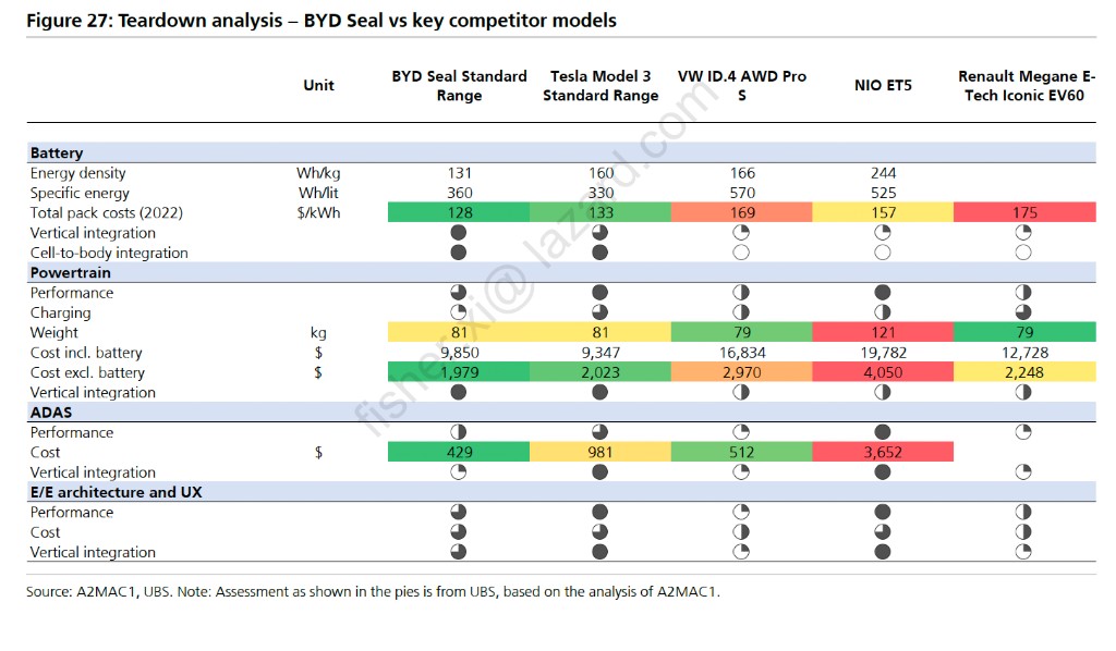 瑞銀稱,比亞迪可以説是中國電動汽車實力的見證者,成為全球電車市場最新標杆。為了更好地瞭解中國領先電車製造商的競爭優勢和供應鏈,瑞銀拆解了比亞迪最新款海豹汽車,對比亞迪的動力系統進行了詳細分析,包括磷酸鐵鋰 (LFP) 電池電池、E/E 電氣電子系統架構和 ADAS 智能駕駛輔助系統,並將其與之前拆解的大眾 ID.3 和特斯拉 Model 3 進行了比較。