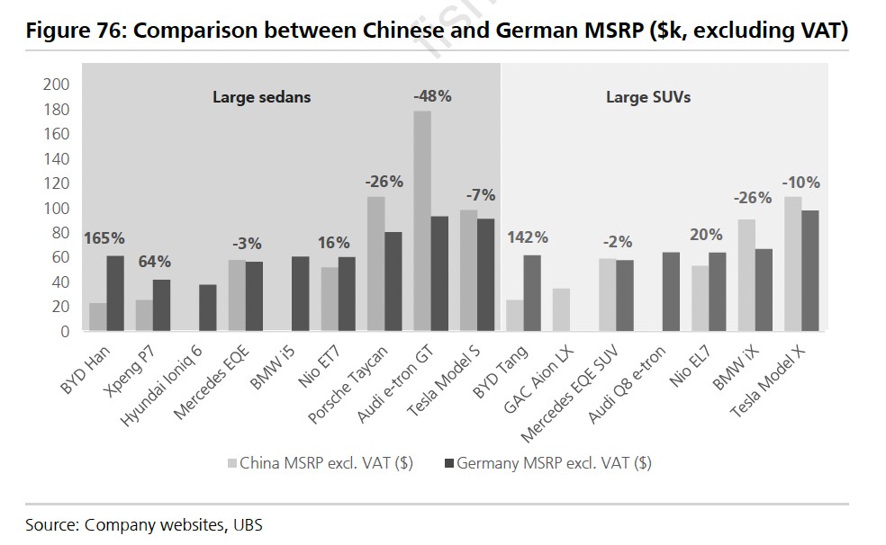 瑞銀稱,歐洲本土汽車製造商如果不降價,將被擠出市場。與同類產品相比,10%-15% 的降價幅度是贏得客户的必要條件: