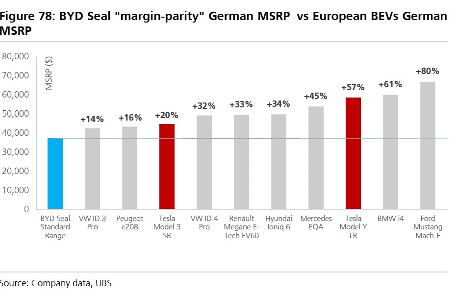 瑞銀在報告中分析稱,假設比亞迪在歐洲銷售時的利潤與在中國本土的利潤持平,可以發現比歐洲本土汽車至少便宜 15%,這種情況是不可持續的,預計大眾汽車需要大幅降價,來避免市場份額的流失: