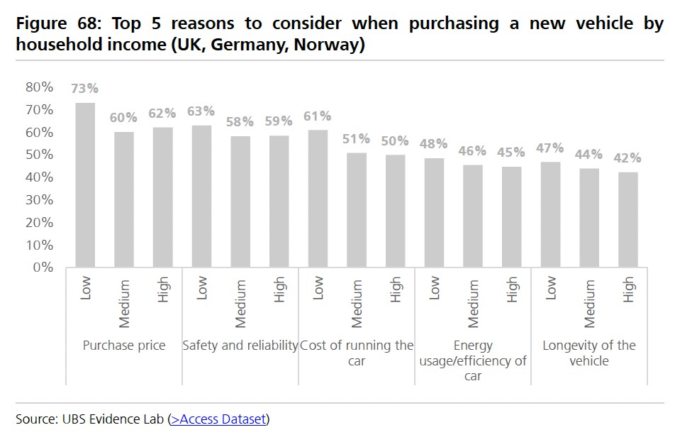 瑞銀稱,根據調查顯示,對於歐洲消費者(以及其他地區的消費者)來説,購車價格是最重要的決策因素,中國的經濟型電車很可能會在歐洲市場從傳統的燃油汽車轉型中搶佔大部分份額: