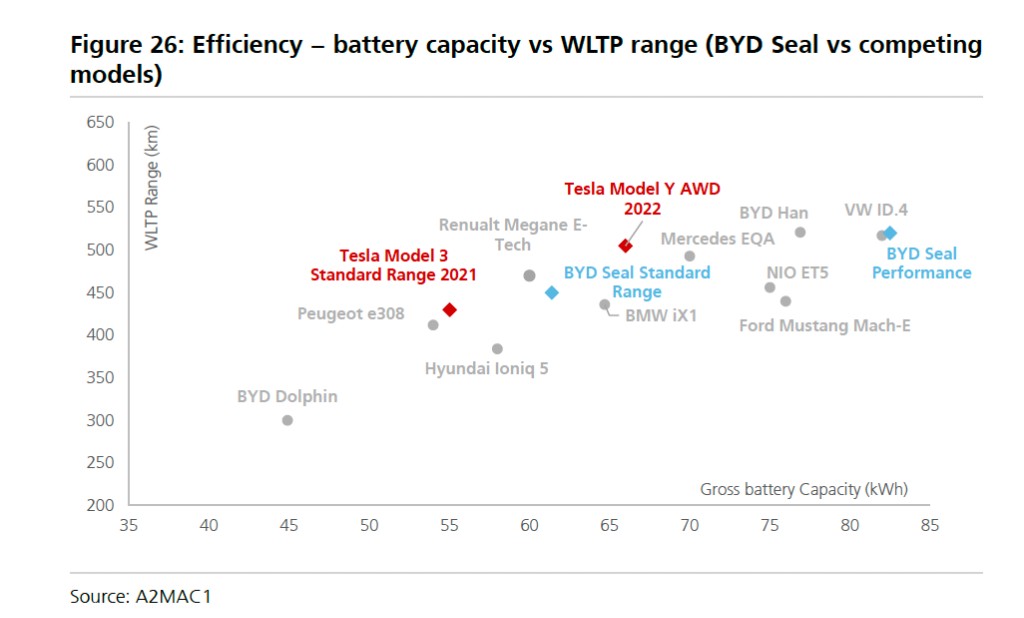 在效率方面(WLTP 續航里程與電池容量之比),比亞迪海豹在同級別車型中處於平均水平。特斯拉憑藉一流的空氣動力學設計和高效的動力系統保持領先。