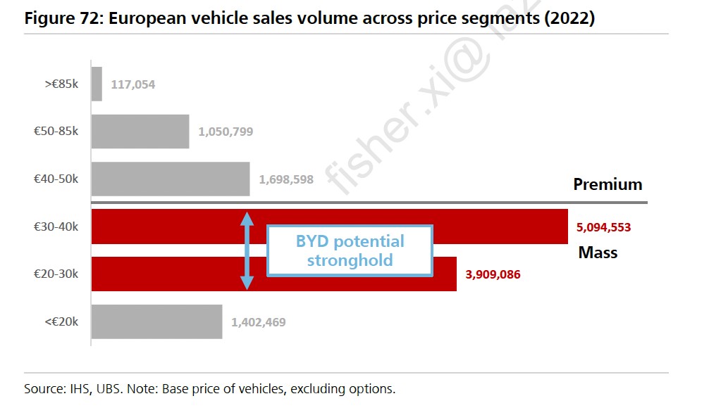 瑞銀稱,大眾、斯泰蘭蒂斯的經濟型車以及雷諾等經濟型汽車受到的威脅最大,同時,比亞迪逐步佔領歐洲市場也會對日本和韓國汽車製造商產生影響: